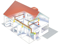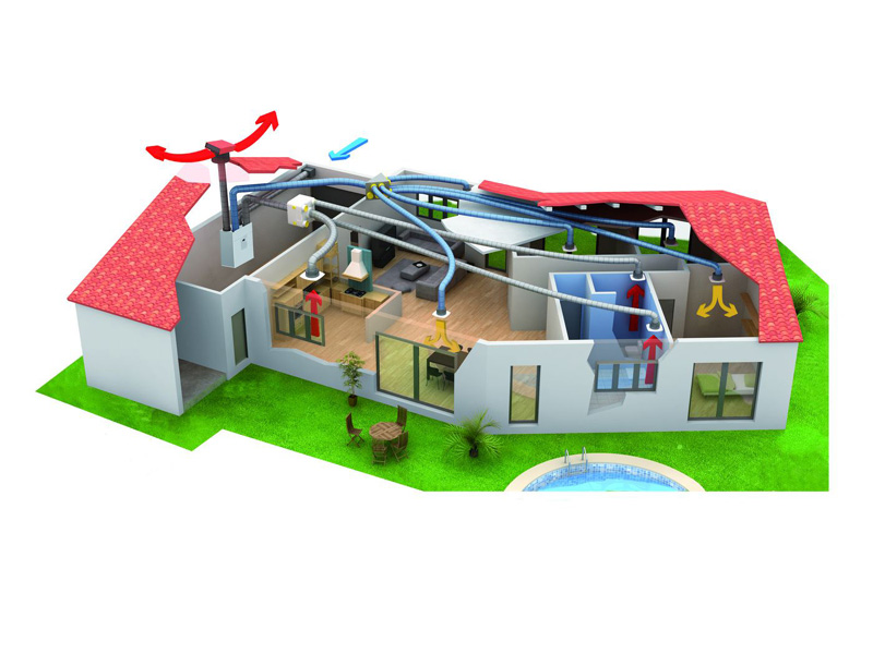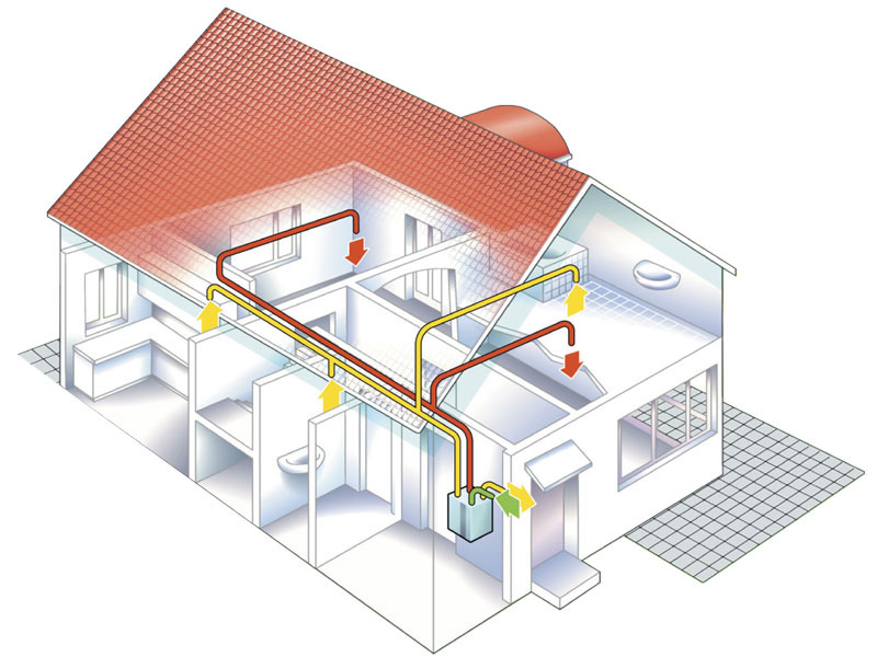 Předehřátý čerstvý vzduch je dále v objektu rozváděn do jednotlivých obytných místností, jako jsou ložnice, obývací pokoje, pracovny atd. Z místností jako jsou WC, koupelny, kuchyně je znehodnocený vzduch odváděn. Tím je dosaženo proudění přivedeného vzduchu interiérem domu a tedy požadovaného celkového provětrání objektu. Do ventilačního sytému nedoporučujeme napojit kuchyňskou digestoř z důvodu možného zanášení vzduchotechnického potrubí nečistotami z vaření.