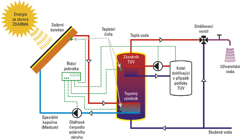 Při průměrném množství sluneční energie, které na ČR za 1 rok dopadne - cca 1000 kWh na metr čtvereční (v přepočetu na průměrnou cenu elektrické energie je to cca 3000 Kč), lze tedy instalací solárního systému ušetřit velkou část nákladů na přípravu teplé vody, vytápění objektu, ohřev bazénu a jiných technologických zařízeních s potřebou tepla a to při minimálních provozních nákladech.